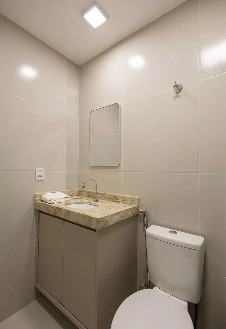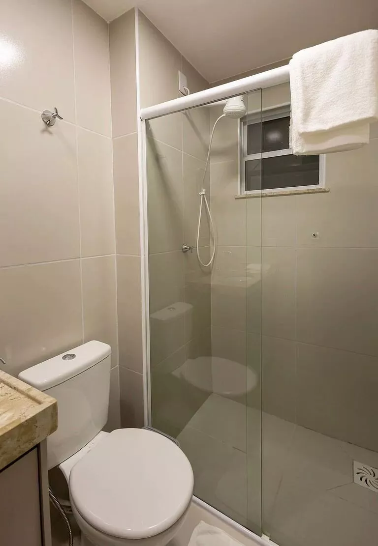 🚿 Banheiro planejado: Box de vidro e chuveiro elétrico, garantindo maior conforto e organização.