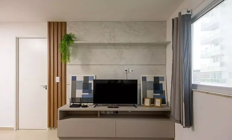 🛋️ Sala de Estar: sofá confortável, ventilador, rack e televisão para momentos de lazer.